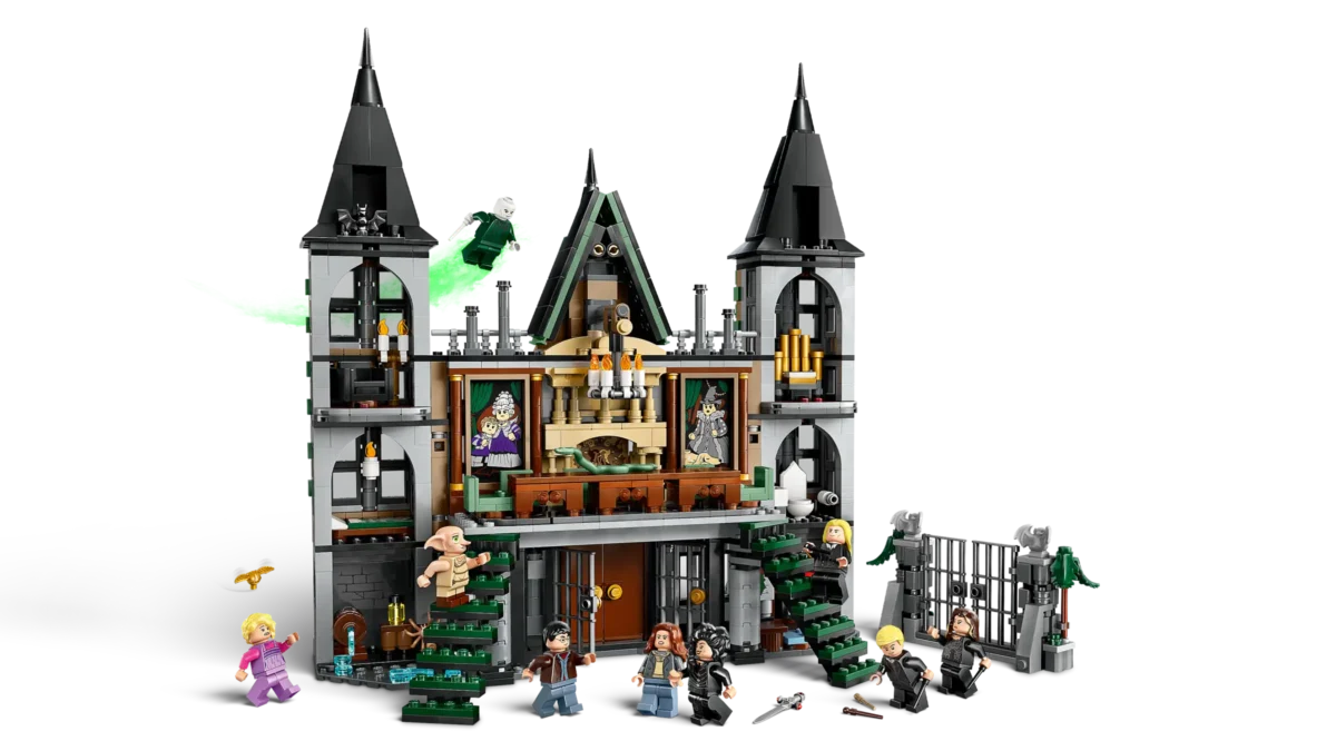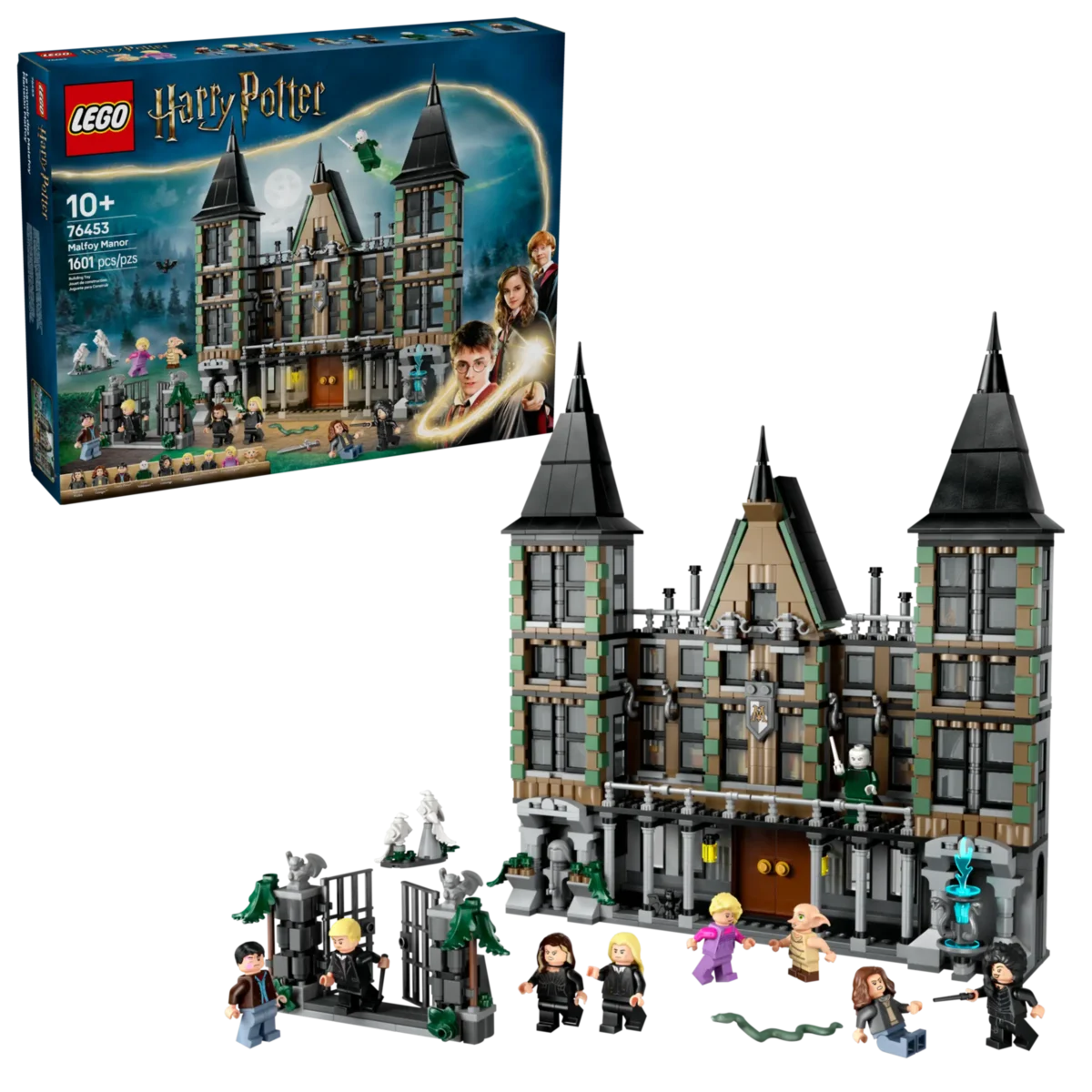 Dimensions – The Malfoy Manor buildable model in this 1,601-piece set measures over 12.5 in. (31 cm) high, 11.5 in. (30 cm) wide and 6.5 in. (17 cm) deep
