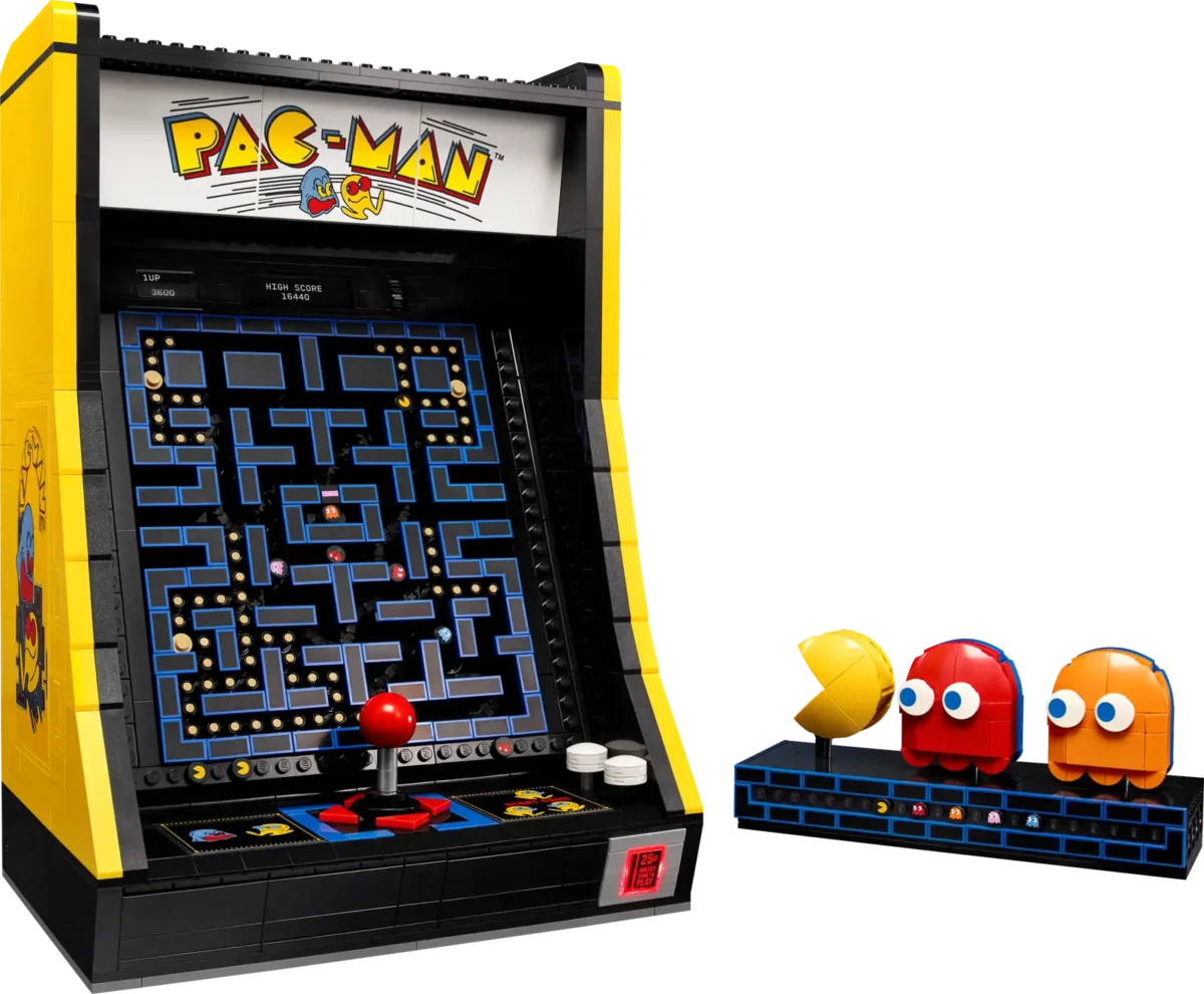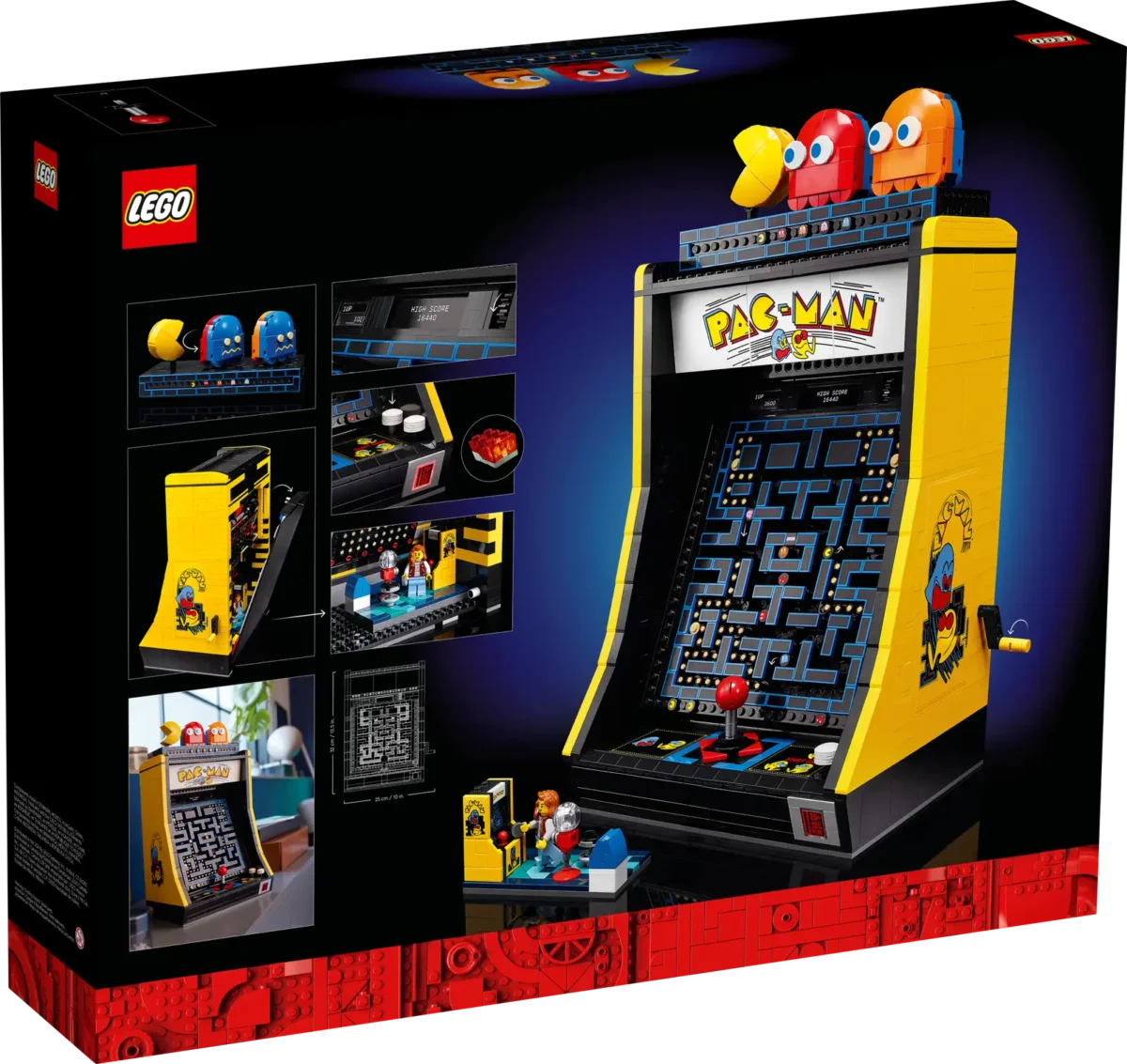 What’s in the box? – Includes all you need to build the PAC-MAN Arcade cabinet and a display case with rotatable PAC-MAN, BLINKY and CLYDE figures, plus a 1980s arcade scene with a gaming minifigure